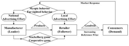 Faced with fierce competing environment, more and more firms tend to act myopically to search for the maximization of short-term profits. However, based on the value-added theory, firms, managers should focus more on the profit in the long run and make decisions far-sightedly. Prior studies explore the decision rules of myopic and far-sighted behaviors and indicate that the difference between these two behaviors is that, a myopic manager makes decision only considering the impact in a finite period, while a far-sighted manager will take the further influence of her decisions into account in an infinite period (Chakravarti et al. [1]; Hauser et al. [2]; Liu et al. [3]; Che et al. [4]). Most of these studies focus on the impact of myopic/far-sighted behaviors on the strategies such as pricing, quality, low-carbon production and so on. However, there are few studies consider their influence on the collaborative advertising activity. Advertising is one of the most important activities for a firm to sell products. It affects consumers’ buying behaviors, brand image, and firms’ profits. Advertising activities include the national advertising and the local advertising (Huang et al. [5]). In the national market, the manufacturer is responsible to cultivate the product’s impression in consumers. And in the local market, the retailer aims to let consumers to buy the products right away. Nowadays, with the rapid expansion of supply chain all over the world, the collaborative advertising activity between the manufacturer and the retailer (both the national and local advertising) becomes more crucial and common in practice. Hence studying the impact of myopic/far-sighted behaviors on the collaborative advertising activities in the supply chain has critical meanings in both practice and theory.