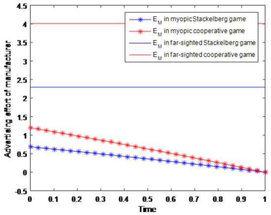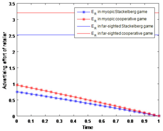 Two different groups of simulation experiments about the advertising effort of manufacturer and the retailer considering the myopic/far-sighted behaviors are shown in Figure 2 and Figure 3. In these two figures, the blue lines with asterisks represent the advertising effort of the manufacturer/retailer in the myopic Stackelberg game situation, while the red lines with asterisks represent the advertising effort of the manufacturer/retailer in the myopic cooperative game situation. Then the blue solid lines represent the advertising effort of the manufacturer/retailer in the far-sighted Stackelberg game situation, and the red solid lines represent the advertising effort of the manufacturer/retailer in the far-sighted cooperative game situation. Based on the simulations about the advertising effort of manufacturer in Figure 2, we can know that in the far-sighted situation, including both the Stackelberg game and cooperative game, the optimal effort of manufacturer remains stable over time. It indicates that if the manufacturer is far-sighted, which means that he will focus on the long-term profit maximization, he will make a high level effort of advertising initially and maintain this level to the end. However, when the manufacturer is myopic, which means that he will only focus on the profit maximization in an immediate time interval, he will decrease his effort level as time goes on in this short interval. In this way, the effort level in myopic situation varies with time and generally is decreasing. On the other hand, from Figure 1 we can also know that the effort level of the manufacturer in cooperative game situation (whether it is far-sighted or myopic) is higher than that in the Stackelberg game situation. In the far-sighted situation, this kind of increment is reflected in the intercept; while in the myopic situation, it is reflected in the slope. Likewise, the laws of far-sighted and myopic efforts of retailer in Stackelberg game and cooperative game in Figure 3 are the same as the manufacturer efforts in Figure 2.