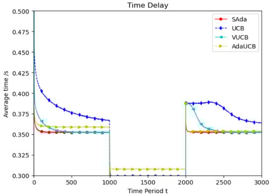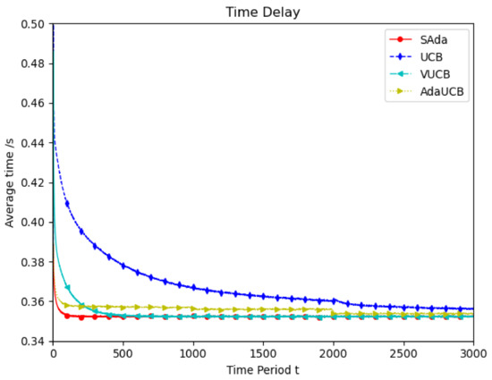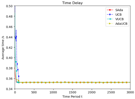 Considering the spatiotemporal dynamics of the TUE, we simulate it at low speed, high speed and random speed. As shown in Figure 2, TUEs with a faster moving speed of are considered as the experimental object. In the first epoch, UCB and VUCB have the same approach rate, and the optimal average delay is higher. SAda and AdaUCB have a lower delay and approach rate than UCB and VUCB. Further, SAda has the minimum average delay and optimal delay approach rate. During the second period, due to the emergence of more SUEs in the system, the task requirements of TUE can be processed more fully and quickly, so that the optimal delay is reduced. With the departure of SUEs, the system’s task processing delay increases. SAda also has the lowest approach rate and the fastest optimal delay approach rate compared to the other algorithms in the third epoch. It is obvious that, throughout all the epochs, SAda has the optimal delay and approach rate.