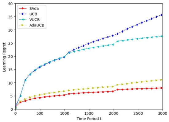 - A learning method during offloading tasks is introduced. With no need to obtain the exact transfer rate and CPU resources, TUEs can observe and learn during offloading computing tasks and can select candidate SUEs based on past offloading experience. In order to prove the performance of SAda, the learning errors of SAda are evaluated with three existing algorithms, which represents the difference between the delay of offloading one bit of the task during the learning process and the optimal bit offloading delay. On this basis, we carry out extensive simulations that show that the proposed method achieves good learning performance and can improve the task processing delay.