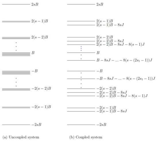 Let us consider the case where one spin is an integer, and the other is a half integer. Some examples of such spin combinations are and . The energy eigenvalues of the Hamiltonian for a general () coupling are shown in Figure 1. It is to be noted that a term common in all the eigenvalues has been neglected as the physical properties of the system would be independent of it. The ordering of these energy levels would depend upon the conditions on the parameters which the positive work condition for the system would provide, which will be discussed in the coming sections.