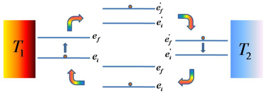 The above implies that , thereby making the lowest energy of the system and the energy of the first excited state. Now, Equation (18) opens different possibilities for the arrangement of other energy levels. For example, the levels and have an energy gap of , and either of them can be at higher energy state than the other, and both the arrangements are acceptable. For the sake of concreteness, we assume the condition that there is no level crossing when is changed to a lower value . One method of arranging the energy levels, in accordance with Equation (18), is shown in Figure 1, which is assumed for the discussion that follows. The net entropy production in one cycle for the coupled system can be written as follows.