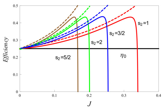 The heat absorbed from the hot reservoir is given by , where X and Y are as defined in Equation (12). From the energy levels diagram, it is clear that the contribution to the exchanged heat comes solely from levels which depend on parameter J apart from the field B. Now, since , this ’extra’ contribution to heat is not available for conversion into work, and it is wasted if . However, it may be utilized to enhance the efficiency of the cycle if , thus effectively decreasing the heat absorbed from the hot reservoir. Remarkably, the WCS considered earlier implies that all terms entering the sum for Y are negative, and so we have with . Thus, the WCS directly results in a regime where we can expect an enhancement of the efficiency. Thus, for the operational regime discussed in previous sections, we can rewrite the expression for efficiency, as follows: