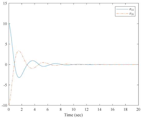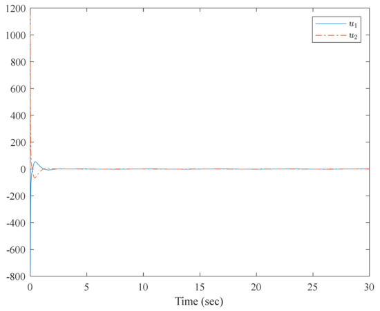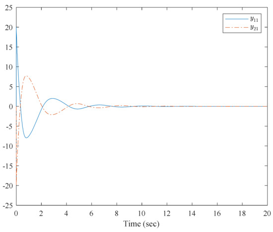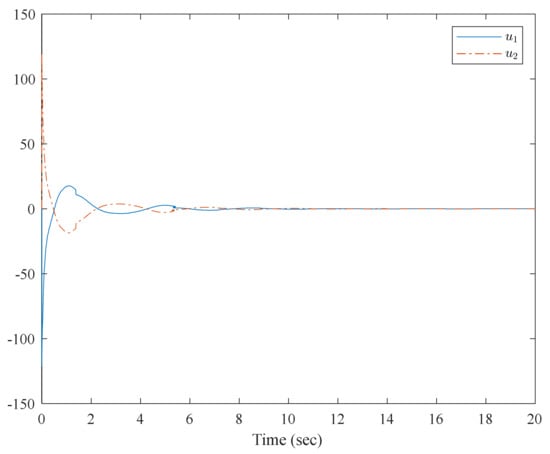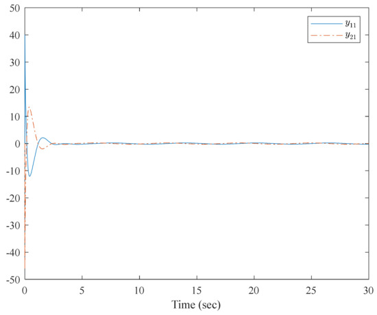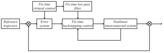 Figure 1 shows the control structure of the closed-loop system. Figure 2 shows the step-by-step design procedure. Figure 3, Figure 4 and Figure 5 are the simulation results. Figure 3 shows the output of the interconnected system and the output of the interconnected system’s convergence to the origin point in finite time, which indicates the control performance of the fixed-time neural network adaptive control. Figure 4 shows the controller of the interconnected system, which is bound and realizable. Figure 5 shows the trajectories of error of the low pass filter, and the error between the virtual control and ideal virtual control indicates that the virtual control is close to the ideal virtual control and that the differential coefficient exists. The simulation results show that the controlled system can become stable in 14 s, and the convergence time can be designed. Even if the states’ initial parameters change, the controlled system can still become stable in 14 s. The system includes unknown nonlinear functions, which verify that the neural network control scheme has strong adaptive ability and approximation ability.