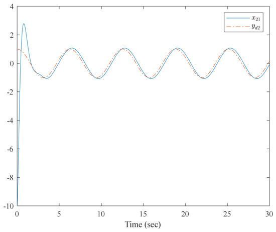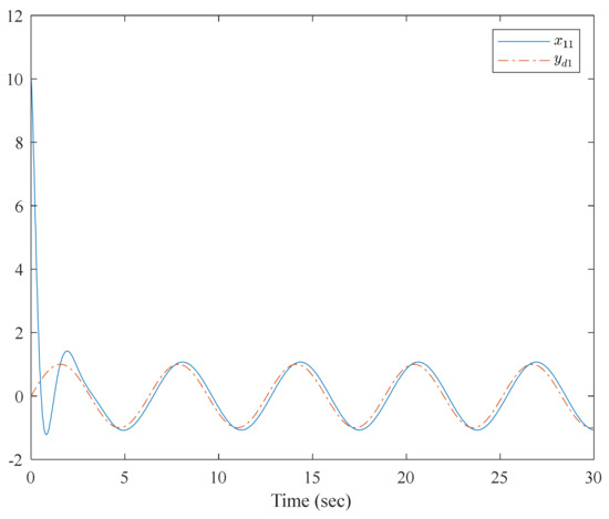 The simulation results are shown in Figure 7, Figure 8, Figure 9 and Figure 10. From the simulation results, it can be seen that the system output can track the desired signal in 2.5 and 5 s, respectively, and the setting time can be designed. Even if the states’ initial parameter change, the controlled system can still become stable in the same time. The pendulum system includes unknown nonlinear functions, which verify that the neural network control scheme has strong adaptive ability and approximation ability. The pendulum system also includes interconnected items, which verify that the control scheme can be applied to interconnected nonlinear control systems.