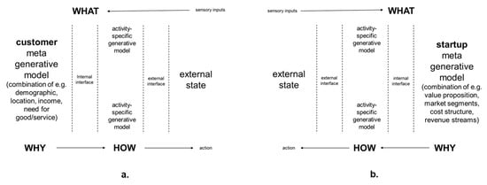As shown in Figure 2 below ideally, after a startup has gone through the lean startup activities, it will have a meta generative model that is aligned with descriptions of its intended potential customers. Meta generative models encompass characteristics that are applicable to many different activities in many different situations. For example, the meta generative model of an individual person can include personality type, which underlies prior expectations during many different situations [54]. Meta generative models for startups’ potential customers can encompass descriptions of goals that they are attempting to accomplish, and their related needs for the startup’s good/service. Descriptions can include visual images that can distill multiple details including demographics, locations, occupations, hobbies, levels of digital literacy, disposal income, etc. As summarized in Figure 2, meta generative models are autopoietic models of self in the world and provide the basis for why actions are taken in the world. Activity-specific generative models provide the basis for how actions are taken in the world. For example, generative models for marketing management activities or generative models for operations management activities. Together with sensory inputs, these generative models, influence what sensory inputs are experienced from actions taken in the world. Such multi-level generative models are often referred to as being hierarchical in accordance with the notion of top-down expectations and bottom-up sensory inputs [54].