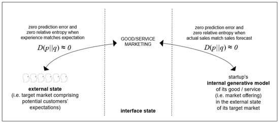Interactions between the internal generative model and the external state takes place across the interface state (i.e., Markov blanket state [31]). For startups, transition towards scaling up takes place across the interface state through marketing that involves analyzing market characteristics, formulating market offerings, and adapting market offerings in relation to market responses. Ideally, marketing will lead to the situation summarized in Figure 3 below, where there is zero prediction error and zero relative entropy between sales forecast (i.e., what is predicted to happen) and actual sales (i.e., what happens). Probabilities can be allocated to predictions and probabilities can be allocated to events as they are happening. For example, the final value of some sales orders may only be definite months after the initial order has been received: meanwhile probabilities can be allocated to the total sales values. Relative entropy (D), sometimes referred to as Kullback–Leibler divergence, is a measure of differences between a reference probability distribution (e.g., a sales forecast) and a related probability distribution (e.g., total sales values). Zero prediction error and zero relative entropy can be achieved through the marketing of the startup’s good/service matching the specification for the good/service. This can lead to the situation where market sales match the startup’s sales forecast. However, poor marketing, such as poor pricing of market offerings, is often a cause of startup failure [2].