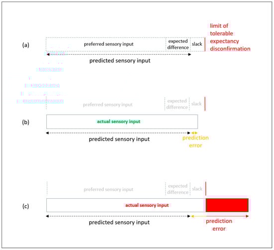 Limit of tolerable expectancy disconfirmation from startup’s market offering. (a) predicted sensory input (preferred sensory input plus expected difference between preferred sensory input and actual sensory input); (b) tolerable prediction error as sensory inputs are farther from preferred than expected but are within limit of tolerable sensory input from unwanted surprise; (c) not tolerable prediction error as sensory inputs are farther from preferred than expected and are beyond limits of tolerable sensory inputs from unwanted surprise.