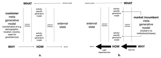 Evolving meta generative model of (a) customers is not matched by (b) market incumbent’s meta generative model that is locked-in to its biases.