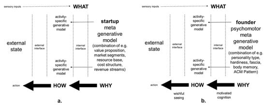 Similarly, action is at the core of AIT [48]. In particular, humans survive by taking action to reduce information gaps between their internal models and reality [30]. This involves actions being taken with the aim of aligning the sensory data predicted by the internal generative models with those data generated by external states. Better aligning includes formulating new internal generative models through insights gained via curiosity in exploring new external states [49]. For other livings things, such exploration may require being physically present in the new external state. By contrast, humans can undertake curiosity-driven exploration without being physically present in the new external state: for example, through discovery via the World Wide Web. Moreover, beliefs about the new external state can exist, at least partially, only in the mind of a person who envisages a future external state: for example, a future external state in which a startup has been founded and has grown into a large organization with global reach. Thus, the formulation of an internal generative model can involve imagining a future external state. In particular, a person can imagine themselves in the future within the imagined future external state [50]. Through this sophisticated active inference, a startup founder can consider simultaneously “what would happen if I did that” and “what I would believe about what would happen if I did that” [51]. Additionally, through theory of mind, the startup founder can consider what other people think about the action taken and what other humans would think about the startup founder for taking the action [52]. Thus, a startup founder can formulate internal generative models that can encompass alternative potential startups situated in future external states. These internal generative models can encompass alternative courses of action, such as market offerings of goods/services, founder’s own feelings about those market offerings, founder’s estimate of potential customers’ feelings about the market offerings, and founder’s estimate of the feelings of society about the startup founder and the startup.