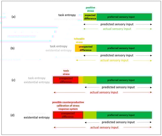 A seventh organizing principle, which encompasses all stages of the startup lifecycle, is to avoid toxic stress that can lead to stress response system maladaptation. In particular, maladaptation through not recalibrating/updating stress responsivity pattern or maladaptation from recalibrating/updating to a stress responsivity pattern that is not congruent with the environment. In order to avoid toxic stress, it is necessary to maintain at least the minimum resources required to enable ecological fitness: i.e., to enable survival in operating markets. This involves the response to the loss of resources, for example from prediction errors, being to carry out resource development to replenish and/or enhance resource stocks. Resource development to prevent toxic stress need not involve large financial expenditure. For example, it can include taking rest, social support, and/or refreshing skills [91,92]. This proactive response to resource loss can be formalized as an explicit policy for active inference by the startup: initially by its founder and subsequently by its management. This can be done with the rationale that replenishing resources reduces potential underlying stress about survival. Thus, while there can be uncertainty, and associated information entropy, about the ways in which resources will be deployed in order to survive, this is not uncertainty about survival itself and the associated information entropy is not existential information entropy that can lead to maladaptive stress. As summarized in Figure 7 below, maintaining resources is necessary to reduce potential for expectancy disconfirmations to take stress beyond positive stress and tolerable stress towards toxic stress [93]. Figure 7a summarizes actual sensory inputs being within expected difference from preferred sensory inputs: i.e., sensory inputs are within the expected range. In such scenarios, information entropy arises from specific uncertainties about particular work tasks [94]: not from uncertainties about survival. There is no need for the startup to draw upon its spare resources (i.e., slack), and stress can be positive involving brief mild stress responses. Figure 7b summarizes actual sensory inputs going beyond expected range but within the scope of the startup’s spare resources. In such a scenario, stress can be tolerable if it is intense but temporary. Figure 7c summarizes actual sensory inputs going beyond expected range and beyond the scope of the startup’s spare resources that have already been reduced by previous prediction errors. In such a scenario, stress can be toxic if it is prolonged. Figure 7d summarizes actual sensory inputs going beyond expected range after all the startup’s spare resources have been consumed by dealing with its previous prediction errors. Loss of resources can increase stress because there are fewer resources available to enable ecological fitness [91,92]. The more prediction errors that are made and the more resources are lost, the more uncertainty there will be about the startup’s survival and higher potential for existential information entropy that can lead to maladaptive stress [29,30]. In such a scenario, stress can be more likely to lead to a counterproductive calibration of the stress response system.