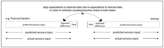 As summarized in Figure 8 below, an eighth organizing principle, which also encompasses all startup lifecycle stages, is to manage expectations. In particular, to align external expectations with internal expectations in order to avoid, what can be described as expectancy discrepancy/violation/disconfirmation [55,95,96]. For example, align customers’ expectations for good/service with startup’s specifications for good/service. Also, to align financial backers’ expectations for sales growth with startup’s plans for sales growth. The alignment of expectations can minimize the startup’s uncertainty about how it will survive. This is because there is minimal information gap between the startup’s internal generative models and the external state. When there is minimal information gap, any prediction errors will be within the range of expected difference from preferred sensory inputs, and stress will be minimal [29,30]. In terms of organization studies, the startup will not be stressed commercially or financially because sales forecasts will be reached, and cash flow forecasts will be within expected range of deviations. In terms of AIT, this corresponds to actual posteriors (e.g., sales income) matching expected posteriors (e.g., sales forecast) with free energy related to actions in the sales policy matching expected free energy, and being less that the variational free energy upper bound [31]. When there is minimal information gap, which is within expected range of deviations in sales forecasts and cash flow forecasts, any stress that is experienced in dealing with sensory inputs from customers and funders can be brief mild stress that can be described as positive stress [93]. Expectations should be updated and realigned in response to the loss of resources and/or the development of new resources in order to minimize potential for future expectancy discrepancies/violations/disconfirmations [55,95,96].