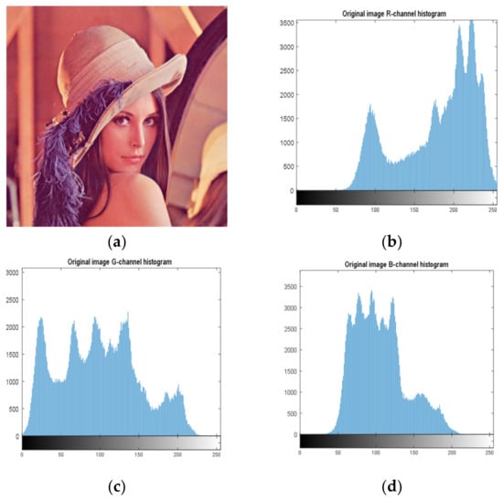 Histogram of components of the original image. (a) Original image; (b) R-channel histogram; (c) G-channel histogram; (d) B-channel histogram.