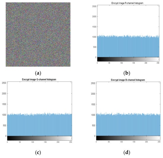 Histogram of each component of an encrypted image. (a) Encrypted image; (b) R-channel histogram; (c) G-channel histogram; (d) B-channel histogram.