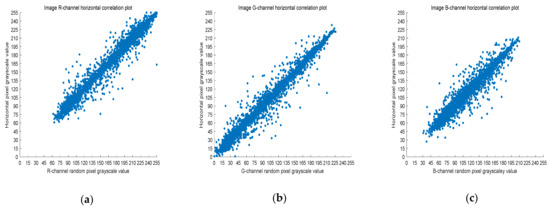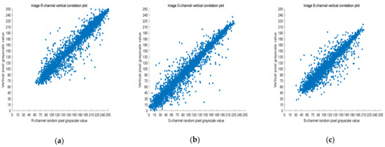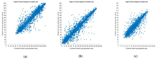 where X and Y are two adjacent pixel sequences, is the covariance of X and Y, and is the standard deviation. When Y is the adjacent horizontal, vertical, and diagonal pixel of each X, is the horizontal correlation coefficient, vertical correlation coefficient, and diagonal correlation coefficient, respectively. Next, is used to measure the correlation of two adjacent pixels according to the following criteria: horizontal, vertical, and diagonal. If is close to one, there is a high correlation between the adjacent pixels. On the contrary, if is close to zero, the correlation between the adjacent pixels is very small.