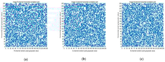 Scatter plot of horizontal RGB component of encrypted image. (a) R-channel scatter plot; (b) G-channel scatter plot; (c) B-channel scatter plot.