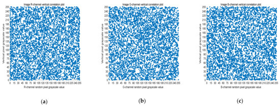 Scatter plot of vertical RGB component of encrypted image. (a) R-channel scatter plot; (b) G-channel scatter plot; (c) B-channel scatter plot.