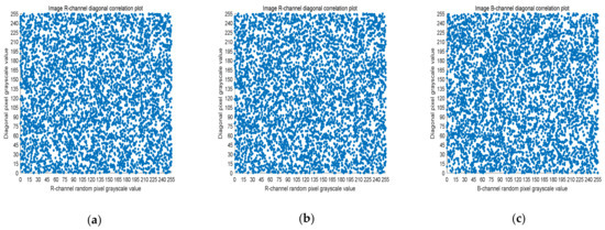 Five thousand randomly selected pairs of adjacent points were used to calculate the correlation coefficients for each direction (horizontal, vertical, and diagonal). As observed in Figure 6, Figure 7 and Figure 8, the pixels of the plain image (512 × 512) are similar to each other, which depicts that they are highly correlated to each other. However, the adjacent pixels of the encrypted cipher image are not correlated (Figure 9, Figure 10 and Figure 11). Table 2 shows that the correlation coefficient of the original image is close to one, which indicates that the image has a very high correlation for different directions. However, the correlation coefficients for all directions of the encrypted image are close to zero, which indicates that there is almost no relationship between the neighboring pixels. This implies that our encryption method achieves a good encryption effect. In addition, it can be observed from Table 2 that our method has a lower correlation coefficient than that obtained after encrypting the image in the reference, so it shows that the algorithm proposed in this paper has better resistance to statistical attacks.