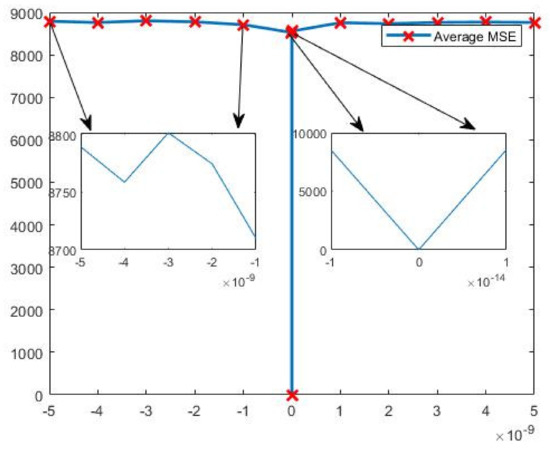 where and g are the normal image and its encrypted image, respectively, and and are the width and height of the image, respectively. expresses the degree of distortion of an image, according to the statistical characteristics of the signal error, and a larger indicates that the average squared error value of the two images at all pixel positions is larger, i.e., the more the distorted image deviates from the reference image, and the lower its degree of similarity. Conversely, the smaller the value, the smaller the distortion and the higher the degree of similarity. In this paper, the average MSE of the image is used to test the key sensitivity of the image, and the change curve of the average mean square error between the decrypted image and the original image, corresponding to our encryption algorithm when the key is varied between , is given in Figure 13. The two arrows on the left side of Figure 13 show the details of the change in the average MSE of the image between –5 × 10^(–9) and –1 × 10^(–9), and the two arrows on the right side of Figure 13 show the details of the change in the average MSE of the image between and , and the images show that when the key is changed very slightly, the average MSE of the decrypted image and the original image will change dramatically, and the average MSE of the decrypted image and the original image after the key change is always above 8700.
