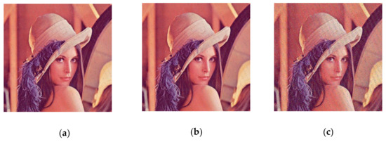 To test the performance of the proposed encryption algorithm against clipping attacks, (a), (b), and (c) in Figure 16 show the encrypted Lena image (512 × 512) after some of the data are clipped off, and (a), (b), and (c) in Figure 17 show the decrypted images corresponding to Figure 16. It can be observed, from the decrypted images, that the cropped encrypted image can also be well recovered by the decryption algorithm, and, therefore, the proposed encryption algorithm has good performance against cropping aggressiveness.