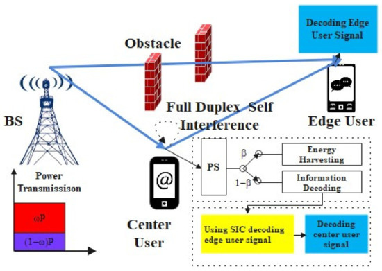 The BS transmits the information data to the cooperative communication users in the kth sub-channel using superposition coding (SC) technology. The relaying center user with a good channel condition receives the signal from the BS and uses power splitting (PS) technology in SWIPT with for energy harvesting and for information decoding. Concurrently, the user uses SIC technology to subtract the edge user information and acts as a relay to decode-and-forward it. The edge user receives the signal from the BS and the cooperative relaying center user and then decodes the information in the maximal-ratio combining (MRC) mode. A FD cooperative NOMA and SWIPT communication network consists of two transmission stages, which are detailed below in Figure 1 and Figure 2.