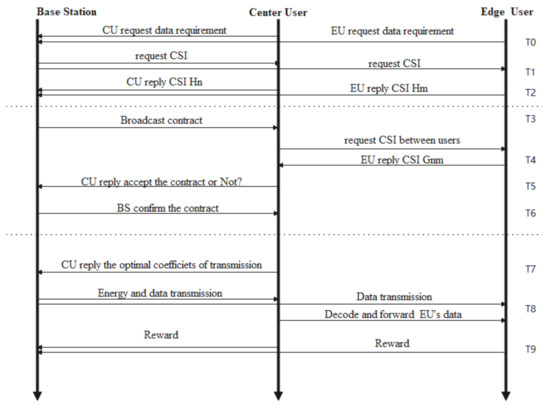 A contract is composed of the BS transmission power and the contract type with the cooperative communication requirement. The whole process of the contract formulation consists of three phases [15]—service requesting and CSI interaction, contract design and confirmation, and contract execution—as described in Figure 3.