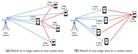 P1 is a Mixed-Integer Non-Linear Programming (MINLP) problem, where is the index of edge user m and relaying center user n which are in cooperative communication in the kth sub-channel. The problem is divided into two power allocation and user pairing sub-problems. In the power allocation sub-problem, a contract theory-based incentive mechanism is adopted to maximize the BS’s benefit utility while maximizing the relaying center users’ payoffs. In the multi-user pairing sub-problem, a match theory with the Gale–Shapley (GS) algorithm is proposed, and the computational complexity is much lower than that of the global searching algorithm.