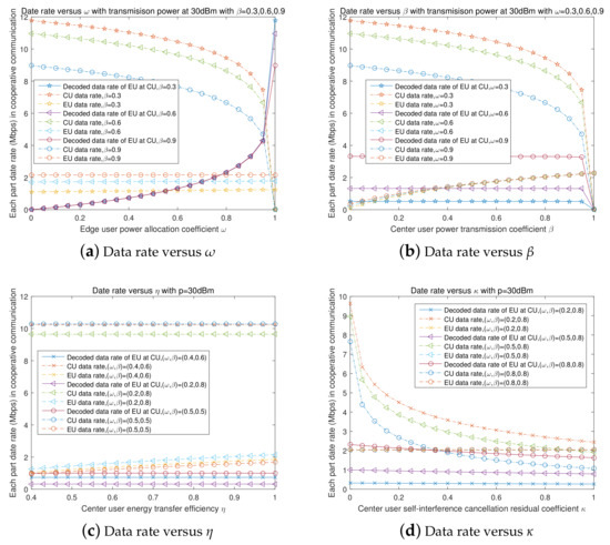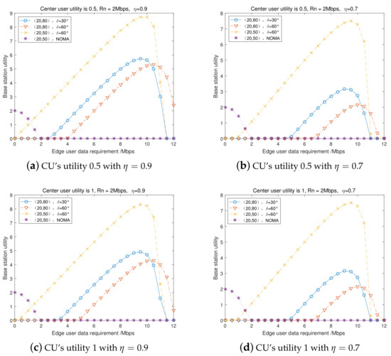 The transmission power was set as 1 W (30 dBm) and 2 W (33 dBm), respectively, in the contract. Under different transmission rate requirements of the center user and energy conversion efficiency, and under different center user and edge user location distributions, Figure 8 presents the center user’s utility (payoffs) versus the edge user’s transmission rate requirement. Figure 8a corresponds to the scenario with = 2 Mbps, , Figure 8b corresponds to the scenario with = 2 Mbps, , Figure 8c corresponds to the scenario with = 5 Mbps, , and Figure 8d corresponds to the scenario with = 3 Mbps, . Figure 8 indicates that, with the increase of the edge user’s transmission rate requirement , the center user’s utility monotonically decreases. After a threshed point, the center user’s utility decreases to 0, which means that the full duplex cooperative NOMA and SWIPT transmission mode cannot satisfy the demands of the user’s data rate. Comparing the four group scenarios, this indicates that a higher transmission rate requirement for the center user would significantly decrease its utility, and the energy transfer efficiency would also significantly affect its utility.