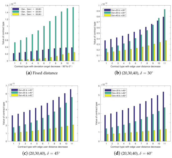 Figure 7b–d separately set the deviation angles between the center user, the edge user, and the BS as , 45, and under the three scenarios, with the distances between the center user and the BS set as 20, 30, and 40 m. The simulation results indicate that the contract type value increases with the decrease of the distance between the edge user and the BS, which also satisfies the IC constraint in Equation (10).
