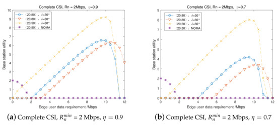 We set the center user transmission rate requirement as and the energy conversion efficiency as and , respectively. Figure 9 presents the BS utility (benefit) versus the edge user transmission rate requirement, comparing three groups using FD NOMA and SWIPT cooperative transmission with one group using conventional NOMA transmission in a complete channel state information scenario. Figure 9 indicates that, when the edge user’s data rate requirement is low, the BS’s utility in conventional NOMA transmission mode is better than the proposed FD cooperative NOMA and SWIPT transmission, with the utility being 0. When increasing , the conventional NOMA transmission mode cannot satisfy the user’s date rate requirement, and the proposed cooperative transmission mode can achieve increased utility until a threshold. Then, the BS utility in the proposed cooperative transmission mode decreases to 0, which means that it cannot satisfy the = 2 Mbps. Comparing Figure 9a and Figure 9b, a higher energy conversion efficiency can result in a higher utility for the BS in the complete CSI scenario.