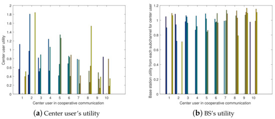 Considering a scenario with 10 center users and 10 edge users (equal to 10 contract types to one center user), Figure 11a,b present the histogram of the center user’s utility and the BS’s utility, which are obtained from the cooperative transmission in the FD cooperative NOMA and SWIPT transmission mode when the center user accepts the contract from the BS. Each color of histogram refers to the utility obtained from the cooperative transmission from different edge users to the center user. A utility of 0 means that the two matched users cannot satisfy the cooperative transmission demand.
