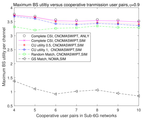 We set = 2 Mbps, = 2 Mbps, . Figure 12 discusses the maximum average utility for the BS versus cooperative transmission user pairs from 4 to 10 in the BS’s coverage areas in 5 transmission and match strategies. For the complete CSI with FD cooperative NOMA and SWIPT transmission, the CU’s utility is 0.5, and this value is 1 for random match and conventional NOMA transmission.