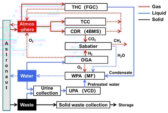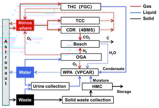 Environmental control and life-support systems (ECLSS) are utilized to meet the survival requirements of astronauts in a space environment. ECLSS can provide a habitable environment with a suitable atmosphere, as well as basic necessities such as oxygen, drinking water, and food for astronauts. In addition, it can remove human waste, CO2, wastewater, urine, and feces. Moreover, the system can realize the functions of pressure relief protection, fire detection and extinction, and harmful gas removal [1,2,3].