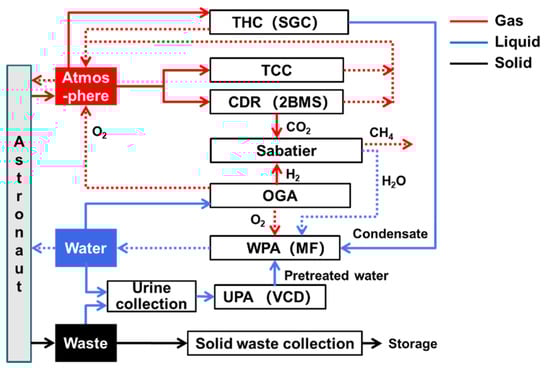 At present, the research of ECLSS is divided into system-level and single-technical-level. System-level research includes overall technical progress [4,5], testing [6,7], software simulation, [8,9] and performance evaluation [10,11]. Single-technical level-research is mainly the design and optimization of specific components, such as carbon dioxide reduction [12], oxygen regeneration [13], water management [14], and waste management [15].