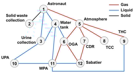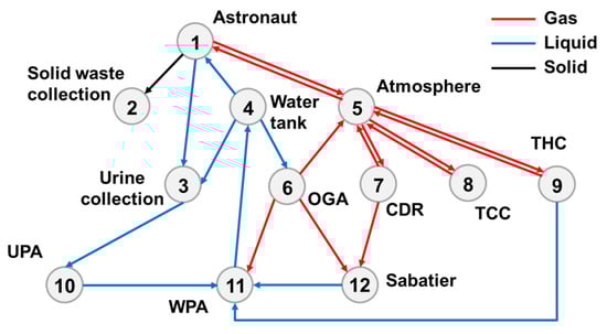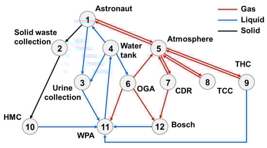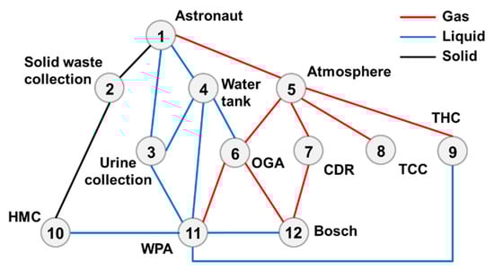 Figure 7 presents the structure of the ISS ECLSS. The structure and material transfer relationship is similar to that of the top-level scheme II, except the temperature and humidity control and CO2 removal technologies.