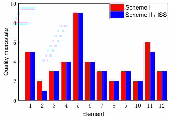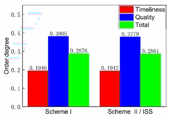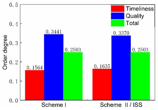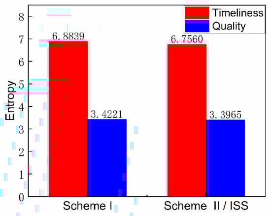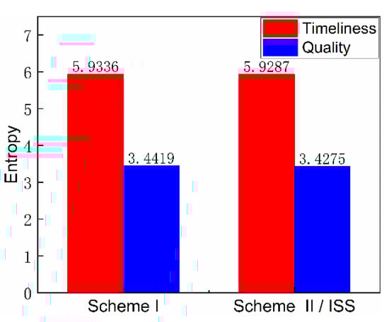 The timeliness entropy and quality entropy of the scheme were obtained by further calculation and statistical processing, respectively, and the order degree was obtained, as shown in Figure 13 and Figure 14. The timeliness and quality entropy of scheme I are both higher than that of scheme II/ISS; the timeliness order degree of scheme I is lower than that of scheme II/ISS. However, the quality order degree of scheme I is higher than that of scheme II/ISS, indicating that it has better information transmission accuracy than scheme II/ISS. Additionally, the transmission efficiency of scheme I is lower than that of scheme II/ISS.