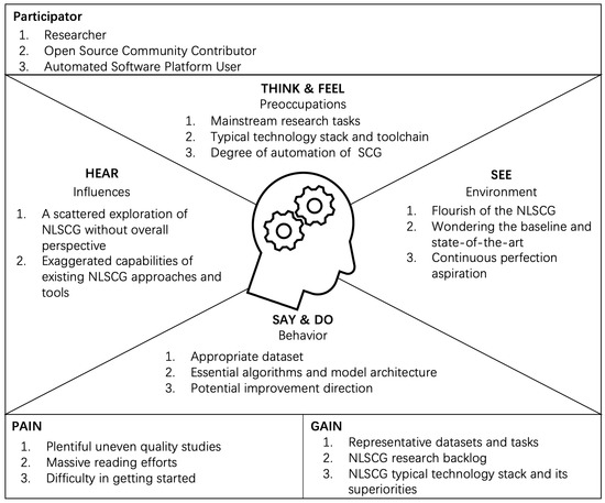 Figure 1) to direct the following research concerns and trends. As the empathy map expressed, participators, including researchers for typical NLSCG models, open-source community contributors for NLSCG products and toolchains, and automated software platform users for considering the degree of automation, are passionate about the NLSCG field. Under the mainstream trend of vigorous development of NLSCG, participants are curious about the baseline and the state-of-the-art NLSCG models.