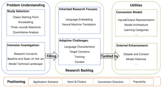 Utilities: As the critical part of the NLSCG solutions, the design and technical implementation details of the transformation models have shown steady attraction for relevant practitioners. Several aspects are particularly remarkable, including the baseline and essential components indicating how the model sprouts; how the advanced models are explored from different angles; how the fuzzy mappings between research concerns and implementations function; and the tactics adopted by every pivotal component. Similarly, we gain much raw information about NLSCG model attempts based on the selected studies from the snowballing. Taking the research backlog as a guideline, we decompose the raw information, convert it into essential components, and then build interactions according to the data processing chain and the conventional deep learning model pipeline. Finally, we summarize and depict all critical tactics and give a detailed explanation of the transformation model, and we regard them as the technical utilities of NLSCG. The utilities can tackle the current backlog items from two directions: Internal model advancement and external enhancement. Apparently, advancements deriving from the transformation model, such as input and output representation, model architecture, learning categories, etc., are worth great effort. Besides, embracing diverse and divergent thinking upon these predefined directions until covering all mainstream processing manners is also an indispensable part of investigating the essential utilities. Some studies go in the opposite direction, searching for probable routes of external enhancement, such as the dataset quality that determines the upper-bounds of the model performance, the retrieval strategy in the model inference stage, etc. The essential utilities would bring a comprehensive understanding of NLSCG models to beginners, and, what is more, it would inspire practitioners with more potential improvements in this field.