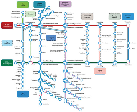 This section summarizes the foremost important part of the NLSCG models through an intensive investigation of the selected studies. The generative model can be regarded as a particular data processing problem, with which it is easy to depict the entire generation process clearly by utilizing a pipeline-based approach. Based on the two main processing pipelines of NLSCG, namely the NL end (description of requirements and intents) and the SC end (executable source code in a specific context); regarding research backlog as guidelines, we decompose raw information from selected studies, and convert them into essential components, and then build interactions according to the data processing chain and the conventional deep learning model pipeline. We propose a latest NLSCG technology landscape illustrated with a metro map metaphor, to explain the NLSCG utilities as vividly as possible. On this basis, the leading technical tactics adopted by each component are elaborated gradually to stimulate more possibilities for model construction.