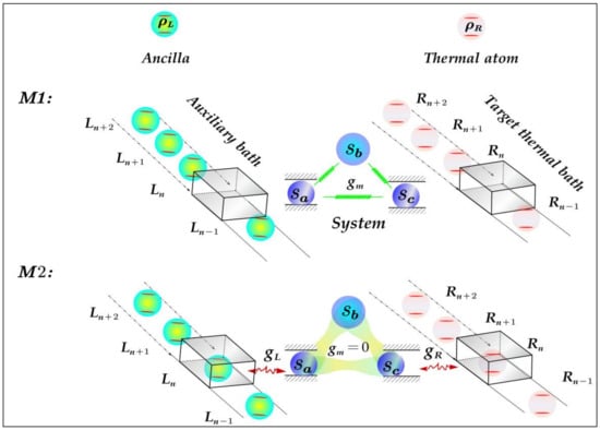 where is the partition function with the inverse temperature (set Boltzmann constant ). In Equation (10), represent the initial states of CAB () and TTB () where each bath of CAB and TTB is composed of identical units. Further, the initial state of each thermal TLA in TTB and for the ancillae in CAB are independently given by: