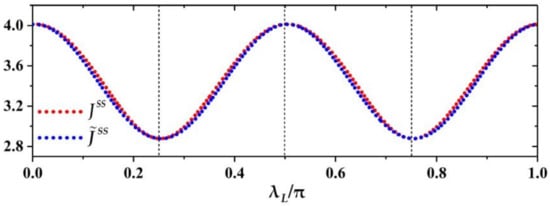 According to Equation (9) we, in Figure 2, plot the variation of THC with the coupling strength , when fixing the other parameters: , , , and (see the red dotted curve). Further, the blue dotted line corresponds to the fitting function with , and . We can see that numerical results (red curve) of the heat current is basically matched with that of the fitting function (blue curve), i.e., . Thus, the THC can be modulated in cosine-like form of and satisfied as for being zero or positive integer. The maximum (minimum) of THC is () with () corresponding to the minimum (maximum) strength of populations (or energy) exchange between the ancilla and the subsystem via the swap operation given in Equation (6). Physically, the nonzero steady heat current also implies that nonequilibrium steady state of system is reached. For simplicity, to denote the increment of system’s energy as injected by the external work source into system in step of each round, the energy increment of system always equals to the sum of increasing amount of two baths’ energy, (the subscript and represent the left auxiliary bath and the right TTB, respectively), in step, i.e., implying no net energy accumulation in the nonequilibrium steady state dynamics. The stronger the swap strength of system-ancilla (i.e., increasing or decreasing in the range of or , ) is, the larger the energy captured by the auxiliary from the system becomes, and that results in the smaller implying smaller THC , vice versa. Therefore, the variety of the THC in Figure 2 with the coupling strength has an opposite trend with that of swap strength, with fixed period . In addition, we can see that for a finite , , the THC with and . In order to observe how the auxiliary bath influence the THC in our model, it might be appropriate take the value of THC for no interaction (i.e., ) of system-ancilla as a reference THC denoted as , with . Using it, the amplification/suppression of THC can be described intuitively, that is and respectively correspond to the heat amplification and suppression. Here, the refrigeration is indicated by the reversal current . Thus, Figure 2 shows that the quantum machine with the thermal auxiliary bath can only serve as a heat suppressor due to the THC being suppressed for a finite , and zero-current or reversal-current cannot emerge, that is, . Meanwhile, by changing the coupling strength the thermal suppressor can modulate THC in the form of cosine-like function in the range of .