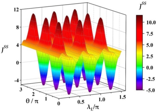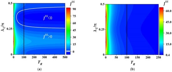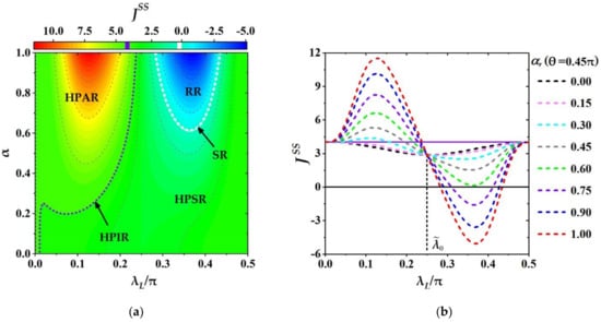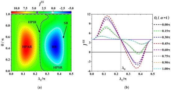 In addition, Figure 4a also demonstrates several obvious features. First, each functional region of HPAR, HPIR, HPSR, SR and RR distributes in a certain continuous parametric space of and . Second, for the convenient descriptions of different functional regions we denote as the coupling strength of HPIR (the purple dotted line at the middle region in Figure 4a), satisfying (note that does not mean the redefinition of the reference current , and only indicates the values of THC at some certain working points on the purple dotted line are the same as reference current as defined before). One can see that the HPAR only lies in the region of below , (i.e., the region of ), and other function regions of HPSR, SR and RR for over , (i.e., the region of ). Further, the SR and RR appear in the middle region of parametric space: and , and the reminder part for the HPSR. Third, for the relative phase taken in RR the quantum machine could perform the different thermal functions in turn: thermal amplifierstabilizationsuppressorswitcherrefrigeratorsuppressor as increases from zero to the maximum in a period.