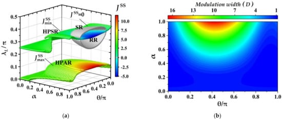 Due to the continuous variation of THC with the parameters , and , the thermal functions of quantum machine are determined by the maximum and the minimum of THC, i.e., to judge which functional regions of HPAR, HPIR, HPSR, SR and RR are covered in the range of ~. Therefore, we plot the maximum and the minimum of THCs, and , in Figure 6a and the corresponding modulation width of THC, , in Figure 6b in the full parametric space of , and with , and . The lower and upper colorful surfaces in Figure 6a correspond to the variations of and , respectively, and the sliver gray ellipsoid-like surface for the working points of switcher with . It is noticed that the values of are characterized by the colors on surfaces not the height of the surfaces (the height of surface is for the vertical axis ). From Figure 6a, several features of and have been shown. Firstly, it can be seen that the surface of is always above the one of which indicates that for the fixed coherence parameters of (, ) the maximum of THC corresponds to the small being about , and the minimum of THC for the large with . Secondly, and behave as the positive and the negative correlated to the coherence magnitude α, respectively, i.e., the value of () increases (decreases) as increases, which implies that the modulation width, , of THC is an increasing function of as shown in Figure 6b. Thirdly, the maximum (minimum) values of THC are always larger (smaller) than the reference THC, i.e., () with . Therefore, always remains in HPAR, and could distribute into three regions: HPSR (), RR () corresponding the parts outside and inside the gray ellipsoid-like surface, and SR (). In addition, from Figure 6b one can see that the larger of the coherence magnitude and the closer to relative phase is to , the wider the modulation width of THC becomes, and the better the performance of quantum machine is.