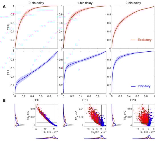Our main goal is to address the role of d on the accuracy of the network reconstruction, with particular regard to inhibitory connections. On this basis, we analyzed in detail local excitatory and inhibitory TE indices at different offsets of the source signal with respect to the target cell. Figure 2 displays results for 0, 1 and 2-bin delays (, 1, 2) both for the excitatory and for inhibitory local components of TE (red and blue, respectively). The down-sampled bin size is 10 ms and the ratio is set to 1:2. The ROC curves in Figure 2A show that at increasing delays, the local excitatory component of TE decays in performance while the local inhibitory component improves. In particular, we note that for delay values greater than 0, in terms of bins, the inhibitory ROC (blue curves) displays a sharp rise at low FPR, indicating a significant increase of the accuracy with respect to the case of zero delay in which TPR is always near to the FPR (Table 1). In Figure 2B we compare the local excitatory component of TE at 0-bin delay with the inhibitory component evaluated for the different delays considered. Delays greater than 0 in the inhibitory part give rise to improved segregation and more accurate reconstruction of real spatial connections. Indeed, excitatory links, represented by red spots, are localized on the top left of the graph, exhibiting high excitatory TE and low inhibitory TE values, while inhibitory connections (blue spots) are localized on the right, being well sorted above the threshold of the inhibitory TE component.