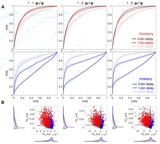 Reconstruction of structural connections at a varying ratio , and at different delays. (A) ROC curves showing the accuracy of excitatory and inhibitory components of TE (red and blue, respectively) in predicting real synaptic connections. ROC analysis is conducted over 10 realizations of the model, based on the same spatial distribution of cells but a different sorting of excitatory and inhibitory neurons. Continuous red and blue lines and corresponding light red and blue areas denote mean and standard deviation, respectively, computed over all the simulations. Dark, medium and light red/blue curves represent ROC at different delays for excitatory/inhibitory connections. TE is evaluated on spike trains extracted from the calcium traces down-sampled at 10 ms. TE components are tested separately in predicting excitatory and inhibitory connections by comparing TE matrices to the corresponding structural adjacency matrices encoding solely excitatory or inhibitory links. Left, central, and right columns show results at a varying balance between excitation and inhibition in terms of synaptic conductance (:): 1:1 (left), 1:2 (central, control case), 1:3 (right). In every case, the local excitatory component of TE decays in performance at increasing delays, while the local inhibitory component increases in performance at increasing delays. (B) Comparison of local excitatory and inhibitory components of TE in a single modeled network. The excitatory component of TE at 0-bin delay is plotted versus the inhibitory component evaluated at 2-bin delay, giving the best segregation and more accurate reconstruction of real spatial connections. Gray dots denote TE indices for uncoupled cells, while red and blue dots denote TE indices for excitatory and inhibitory real connections. Black lines denote the best thresholds for predictions as evaluated in the independent ROC analysis of panel (A), based on the Youden’s J. Left and bottom density plots represent projections of the two-dimensional distributions of TE indices on excitatory and inhibitory components, respectively.