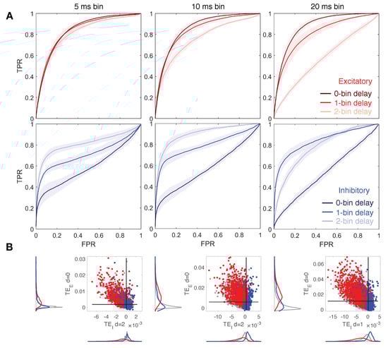 Figure 4 depicts results varying the down-sampled bin size between the values of 5, 10, ms and for a ratio fixed to 1:2. In the case of the smaller bin size, ms, we observe for the local excitatory and inhibitory TE quite similar behavior with respect to the case of ms bins as previously analyzed. However, small differences can be noticed (see Figure 4A and Table 3): excitatory TE is less affected by delay variation since bin size gets smaller; both components preserve good accuracy, but surprisingly, the best performance is obtained with a bin size of ms. This means that increasing temporal resolution in our approach is not only not necessary for efficient structural link detection, it actually makes it worse. An improvement could be achieved by increasing the Markov order , but this implies higher computational costs. On the contrary, for ms bins, the ROC curves show a more drastic performance decay of the local excitatory component of TE at increasing delays. Moreover, prediction of inhibitory links results in higher accuracy for 1-bin delays and worse for 2-bin delays. Figure 4B shows that good segregation of excitatory and inhibitory connections can be achieved for each bin size by choosing an appropriate delay.