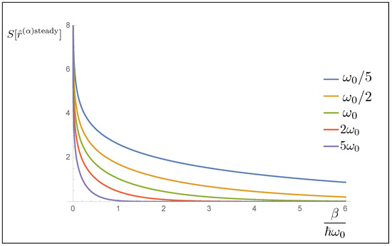 as it can be found using Equation (50) and going through some algebra. One can immediately see that the entropy depends on the temperature, both through the partition functions and the occupation numbers of the modes. We plot in Figure 1 the entropy as a function of the temperature for different values of the frequency. From the plot, it can be seen that lower frequency modes have a greater entropy than the modes with higher frequency.