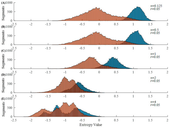 Histogram of EntropyAF values under different parameters: (A) n = 0.125, r = 0.05; (B) n = 0.5, r = 0.05; (C) n = 1, r = 0.05; (D) n = 2, r = 0.05; and (E) n = 4, r = 0.05. The x-axis presents the EntropyAF values and the y-axis presents the number of 30-beat segments.