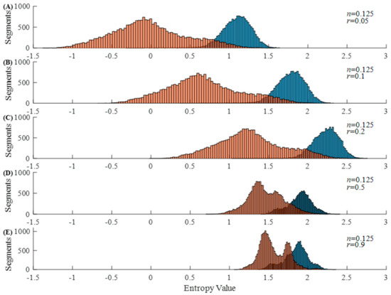 Histogram of EntropyAF values under different parameters: (A) n = 0.125, r = 0.05; (B) n = 0.125, r = 0.1; (C) n = 0.125, r = 0.2; (D) n = 0.125, r = 0.5; and (E) n = 0.125, r = 0.9. The x-axis presents the EntropyAF values and the y-axis presents the number of 30-beat segments.