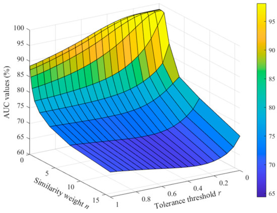 Table 2 gives an overview of the AUC results for classifying AF and non-AF rhythm types under different parameter combinations. The tolerance threshold r was set from 0.05 to 0.95, with a step of 0.05. In addition, two edge values of r = 0.01 and 0.99 were also tested as the optimal AUC value was found on the edge with small r and n values. The similarity weight n was set as , and K varied from −4 to 4, with a step of 1, i.e., n had the following values: 0.0625, 0.125, 0.25, 0.5, 1, 2, 4, 8, and 16. Figure 3 shows the AUC results of 3D color diagram for the space of scanned r and n. The optimal AUC value appeared on the edge, under the condition of the small tolerance threshold r and similarity weight n. The AUC value had a maximum of 98.15% (marked as bold) when the parameter combinations were set as r = 0.01 and n varied from 0.0625 to 0.5; r = 0.05 and n varied from 0.0625 to 0.25; and r = 0.10 and n varied from 0.0625 to 0.125. When the two parameters increased, the AUC values decreased, which indicates the decreased detection capability for the AF rhythm.